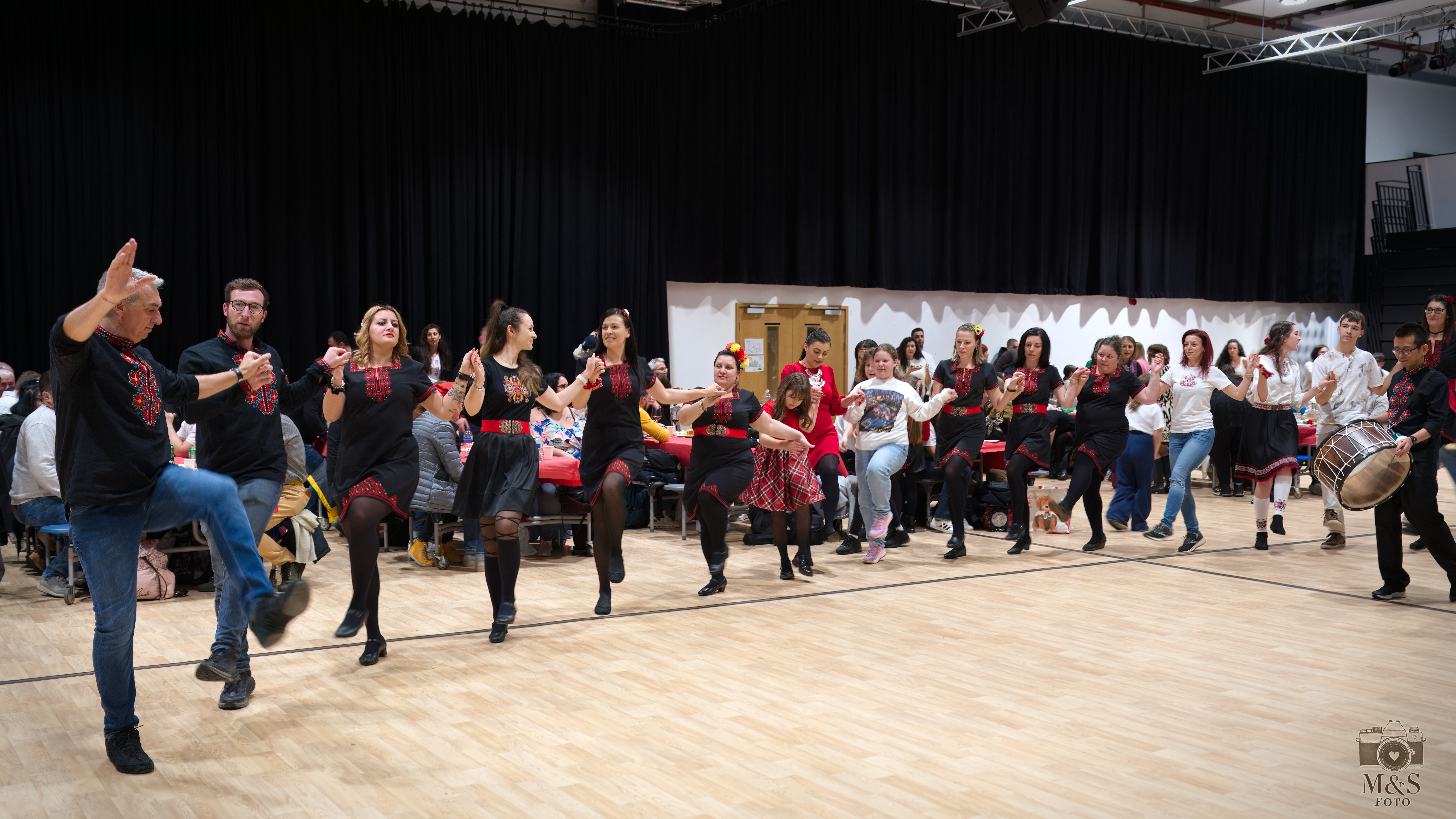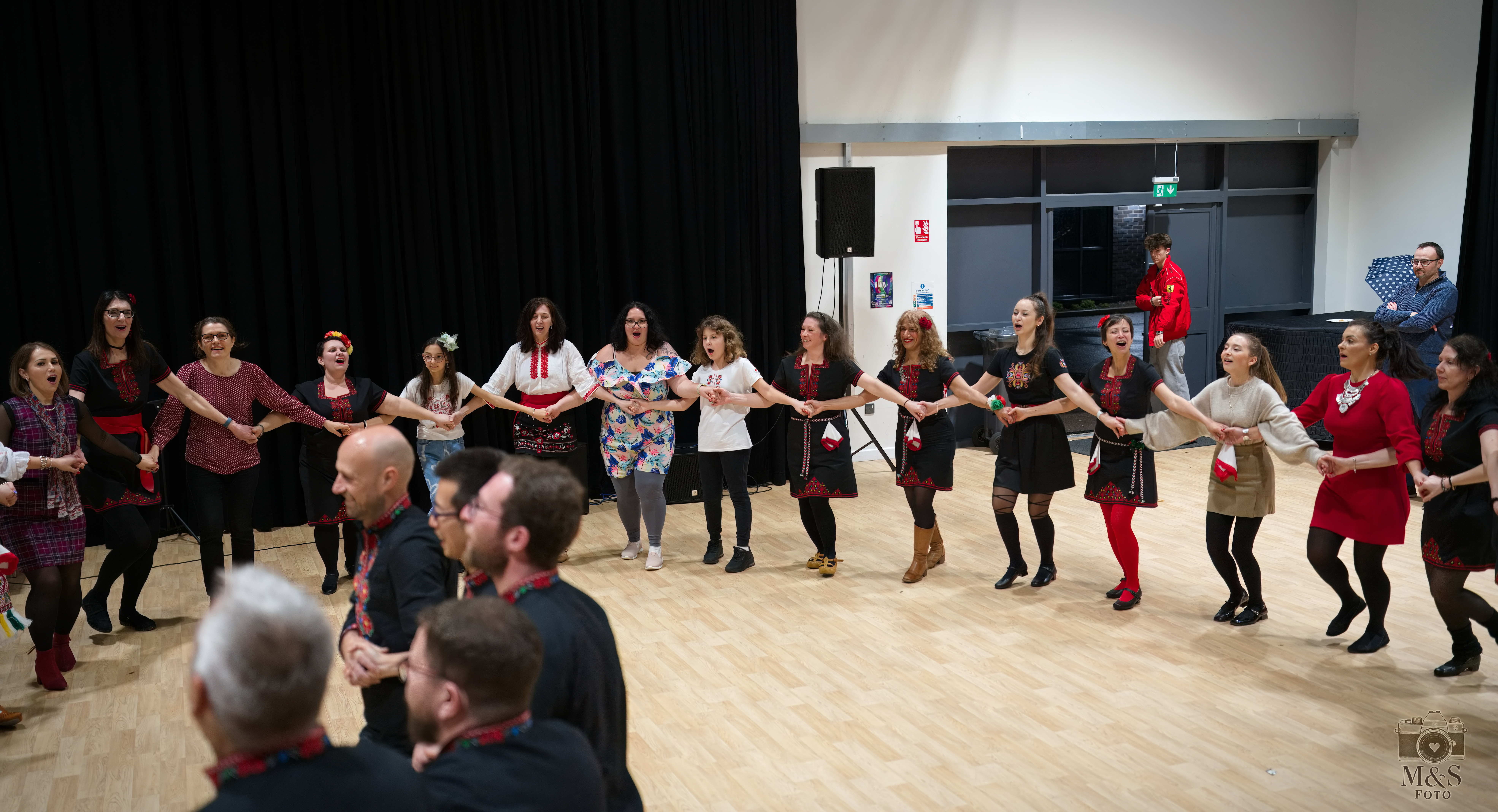 Залата беше изпълнена с енергия и звуците на българската народна музика, а хората бяха водени от познатите ни клубове по народни танци. Приятелите ни от Нова Зеландия, Япония и Палестина обогатиха събитието, като изпълниха български песни на дуо тъпани и тамбура, а ритъма на танците и празничният дух обединиха всички в магията на празника.