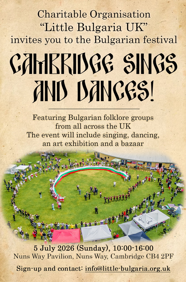 Charitable organization Little Bulgaria UK CIO and partners warmly invite you to join us for our Bulgarian summer festival “Cambridge Sings and Dances!”, taking place on Sunday, 5th July 2026.