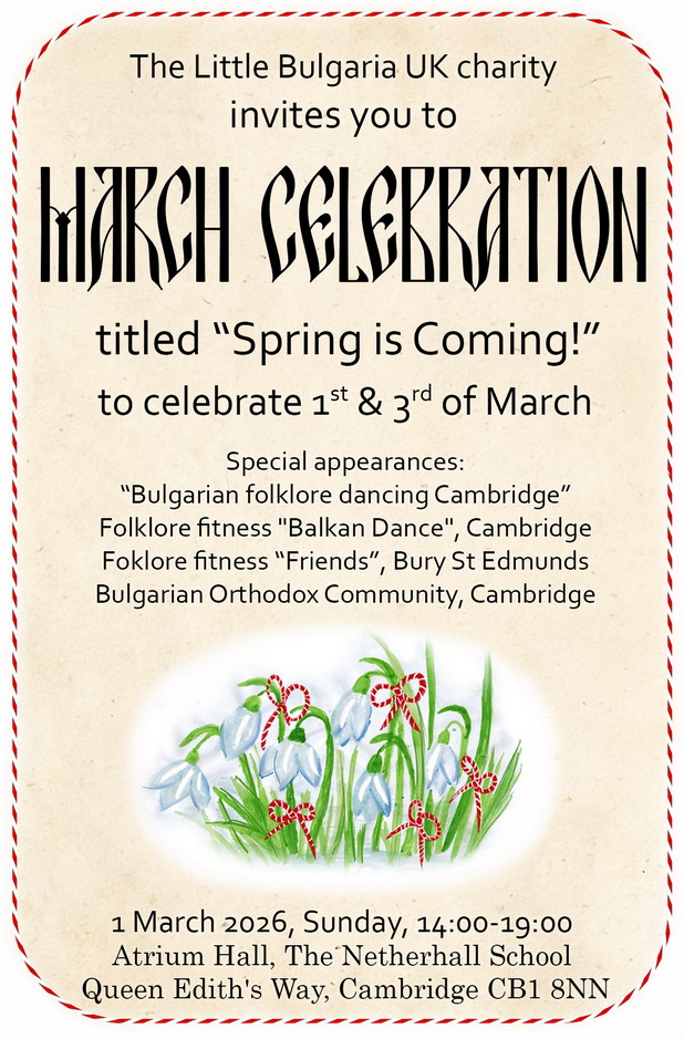 Our programme will feature performances by "Bulgarian Folk Dances Cambridge", Folklore Fitness “Balkan Dance” – Cambridge, Folklore Fitness “Priyateli (Friends)” – Bury St. Edmunds, as well as the Bulgarian Orthodox Community in Cambridge. There will also be a contest for the most original martenitsa.
